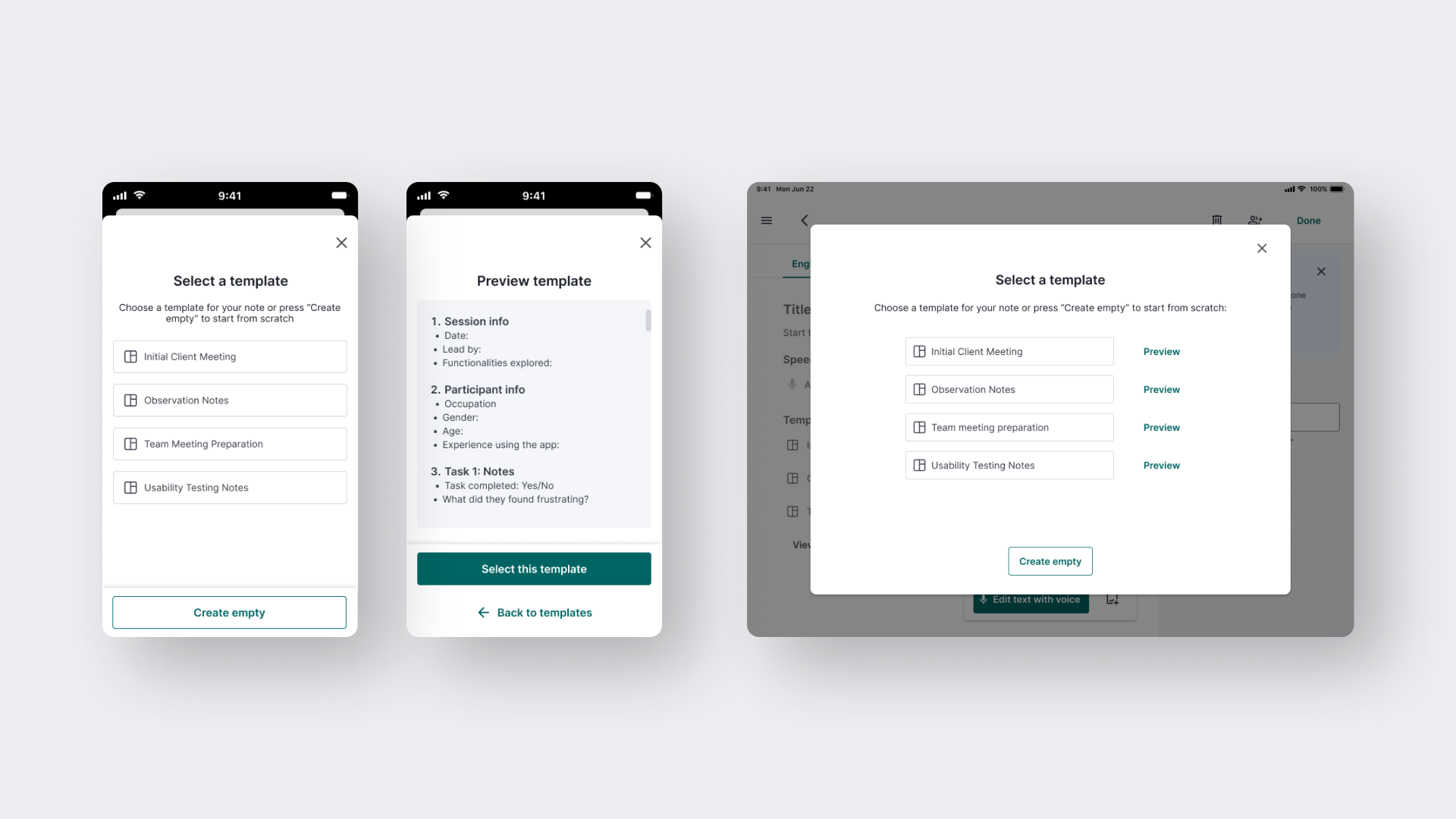 - On a tablet, there's a button to preview a template before selecting it, helping users make informed decisions.