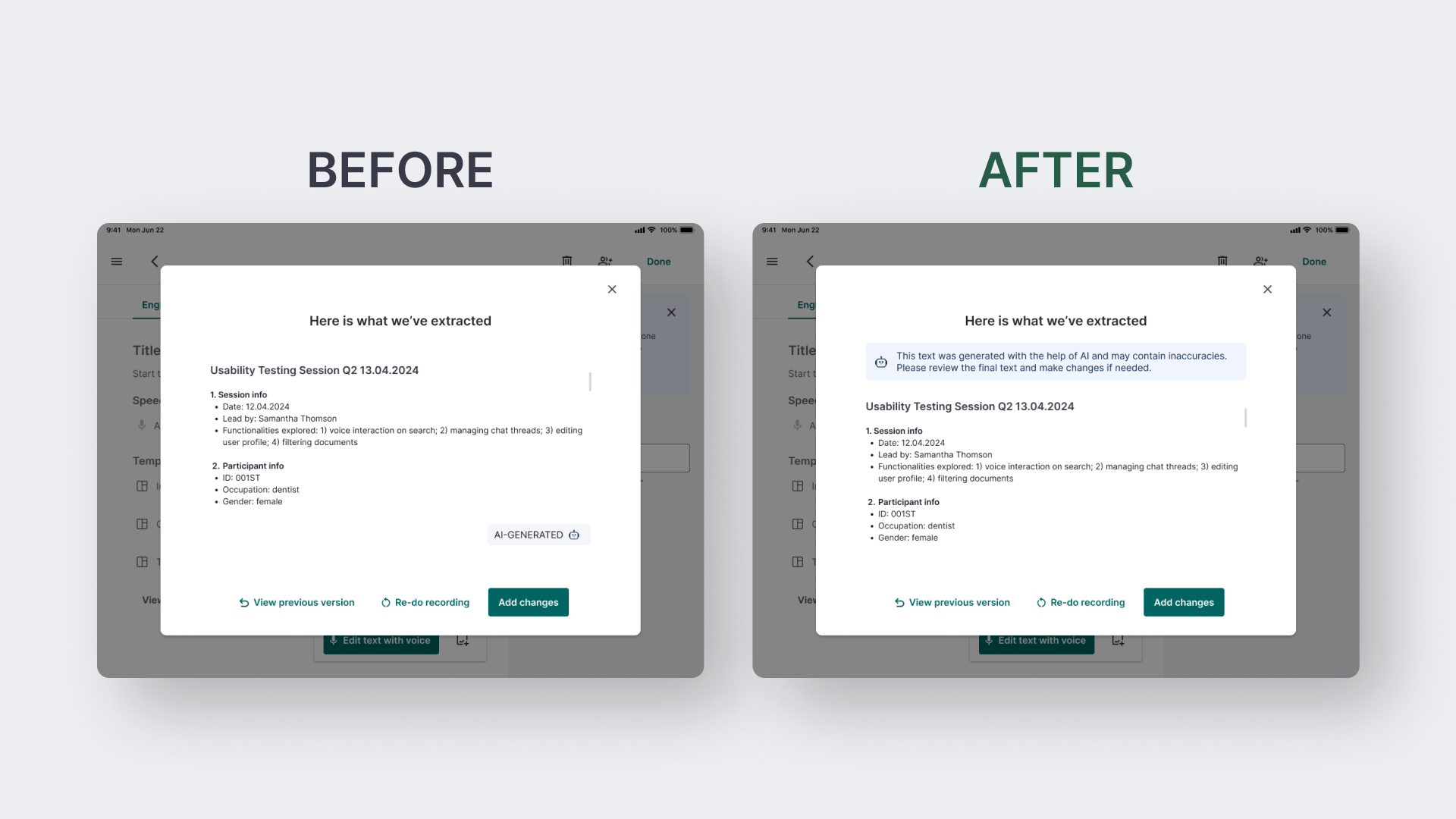 Although AI indicators appear on many screens of this product, we didn't include an explicit AI disclaimer. A machine learning engineer suggested adding one to ensure users understand that AI can make mistakes or misinterpret input data. Therefore, we added an AI disclaimer message to the screen with extracted text.
